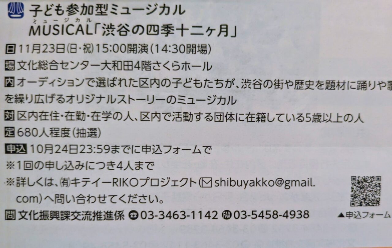 2025年11月23日(日・祝)、文化総合センター大和田で、渋谷区の小学生が渋谷を歌い踊る子ども参加型ミュージカル「渋谷の四季十二ヶ月」が開催されます。