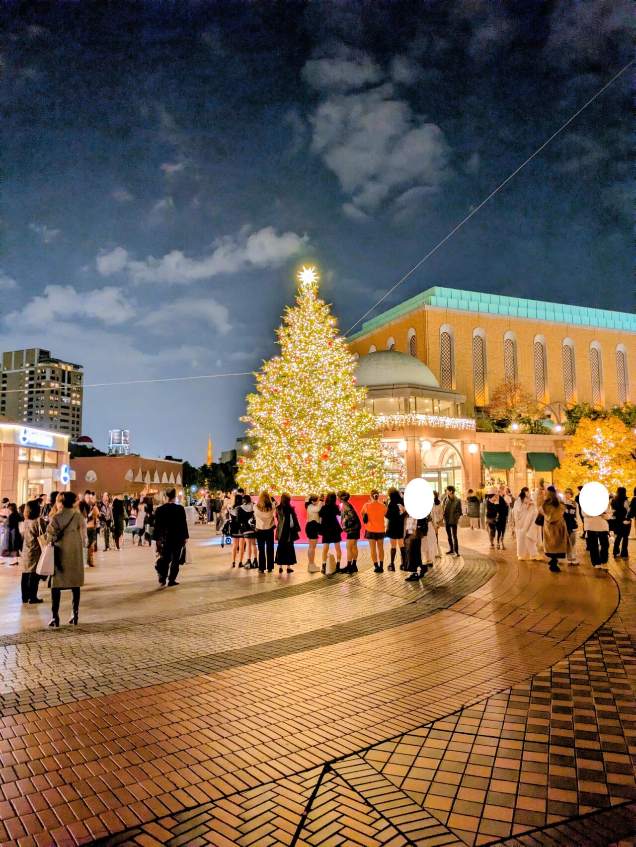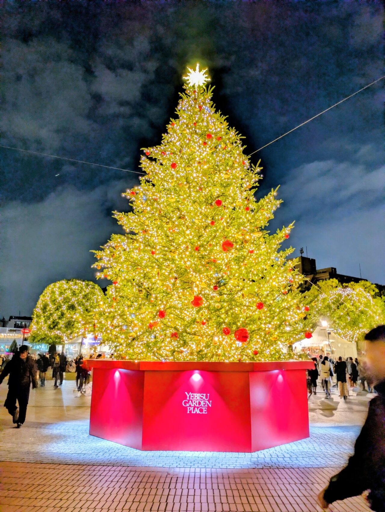 恵比寿ガーデンプレイスでは、11月8日からクリスマスイルミネーション&クリスマスマルシェが始まっています。恵比寿駅から続くスカイウォークを降りると、ライトアップされた大きなクリスマスツリーが目に飛び込んできます。