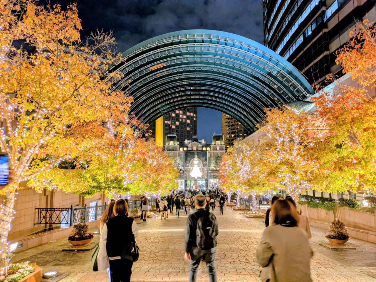 センター広場に続くプロムナードにもシャンパンゴールドのイルミネーションが施されています。こちらのイルミネーションにはなんと10万球もの電球が使用されているのだとか。キラキラして夜とは思えない眩しさです。
