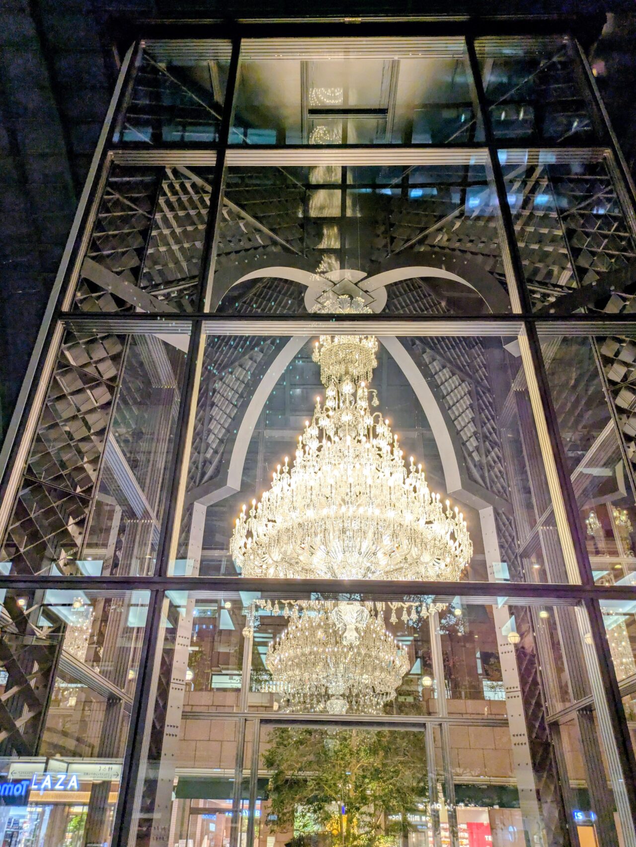 そしてクリスマス時期のガーデンプレイスの目玉といえば、バカラのシャンデリアが有名です。2025年も、恵比寿ガーデンプレイスのセンター広場においてバカラのシャンデリアが展示されています。高さ約5m、幅約3m、クリスタルパーツ総数8,500ピース、ライト総数250灯で世界最大級のシャンデリアなんだとか。ゴージャス!