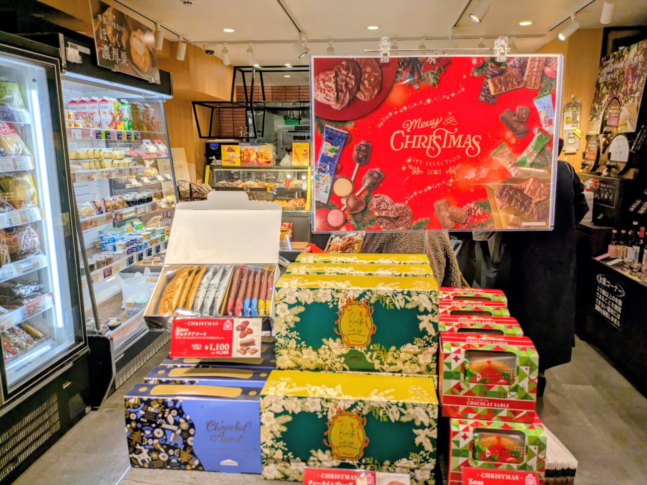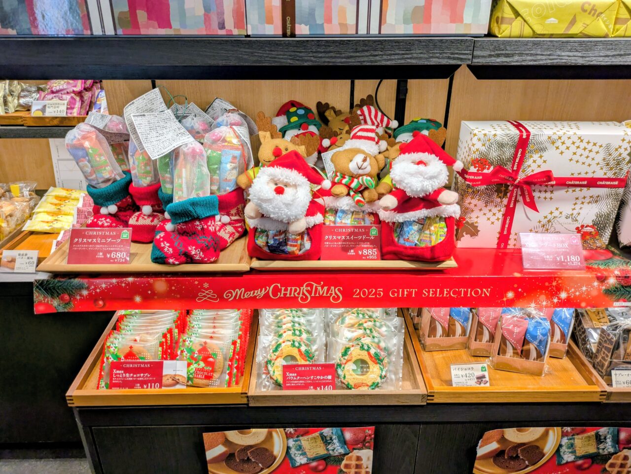 贈り物の焼き菓子やクッキーなどが販売されています。お菓子が詰め合わされたクリスマスブーツのプレゼントもありました。
