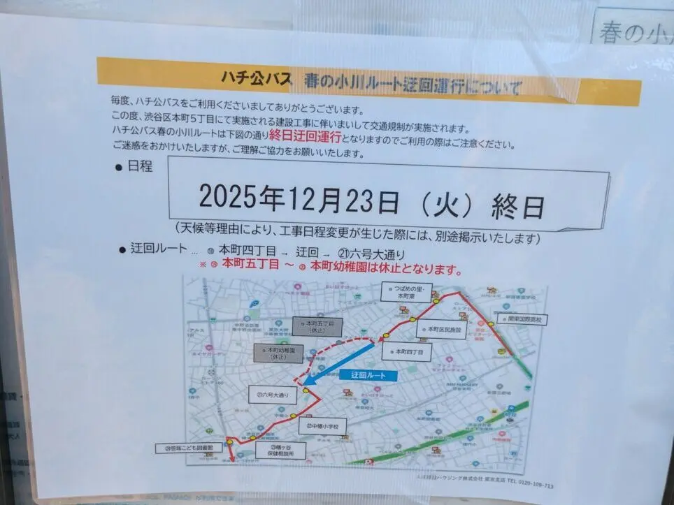 2025年12月23日、渋谷区本町5丁目での建設工事に伴い、ハチ公バス春の小川ルートが終日迂回運行となります。本町5丁目、本町幼稚園には停車しません。ハチ公バス(本町・笹塚循環 春の小川ルート)は、迂回運転となります。ご利用の際は、お気をつけください。