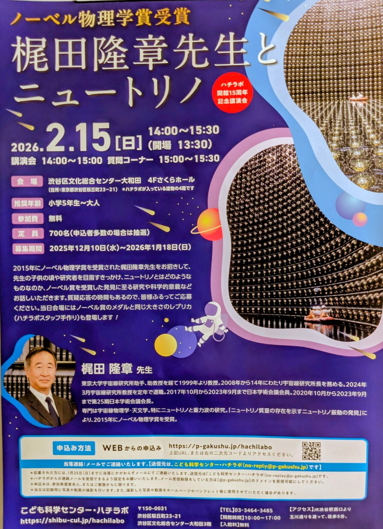 そのノーベル賞受賞者である梶田隆章先生の講演会が 「こども科学センター・ハチラボ開館15周年記念講演会」として文化総合センター大和田で開催されます。