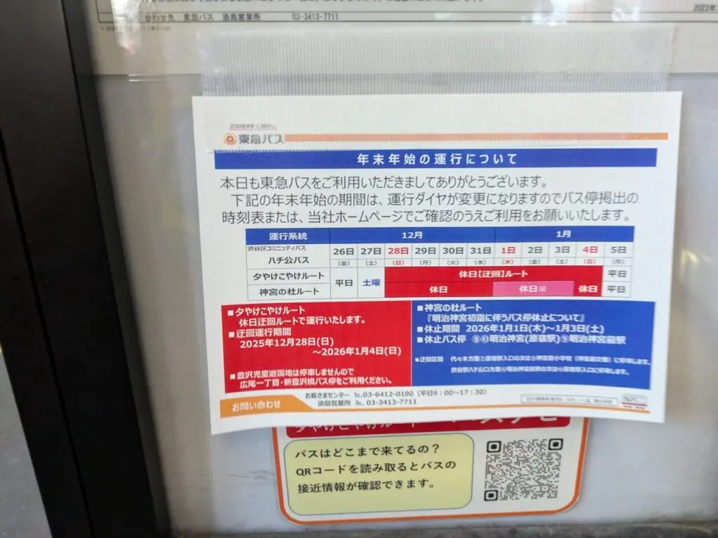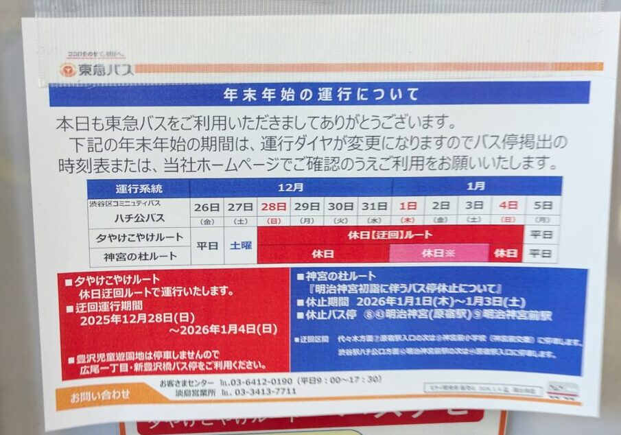 2025年12月28日〜2026年1月3日までのの年末年始はハチ公バスの運行が変わります。全ルートが休日ダイヤ、または休日ルートになります。そして神宮の杜(もり)ルートは、初詣の参拝客で混雑するため明治神宮周辺のバス停は一時休止となります。