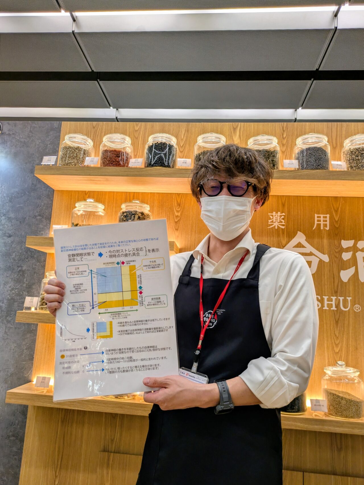 店内奥には、落ち着いた雰囲気の養生カウンターが設置されています。「時間があれば、疲労測定チェックをされてみませんか?」とストアの方に声をかけていただきました。なんだか面白そうと「ぜひ!」とお願いしました。
