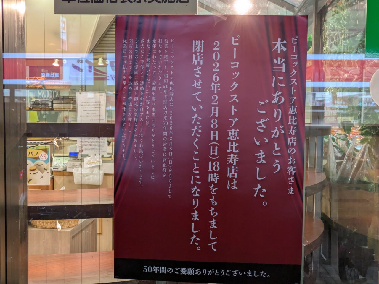 そのピーコック恵比寿店が、2026年2月8日をもって閉店するとのことです。50年間、恵比寿に住む人たちや働く人たちを支えてくれたスーパーマーケット、ピーコック恵比寿店。本当にありがとう!