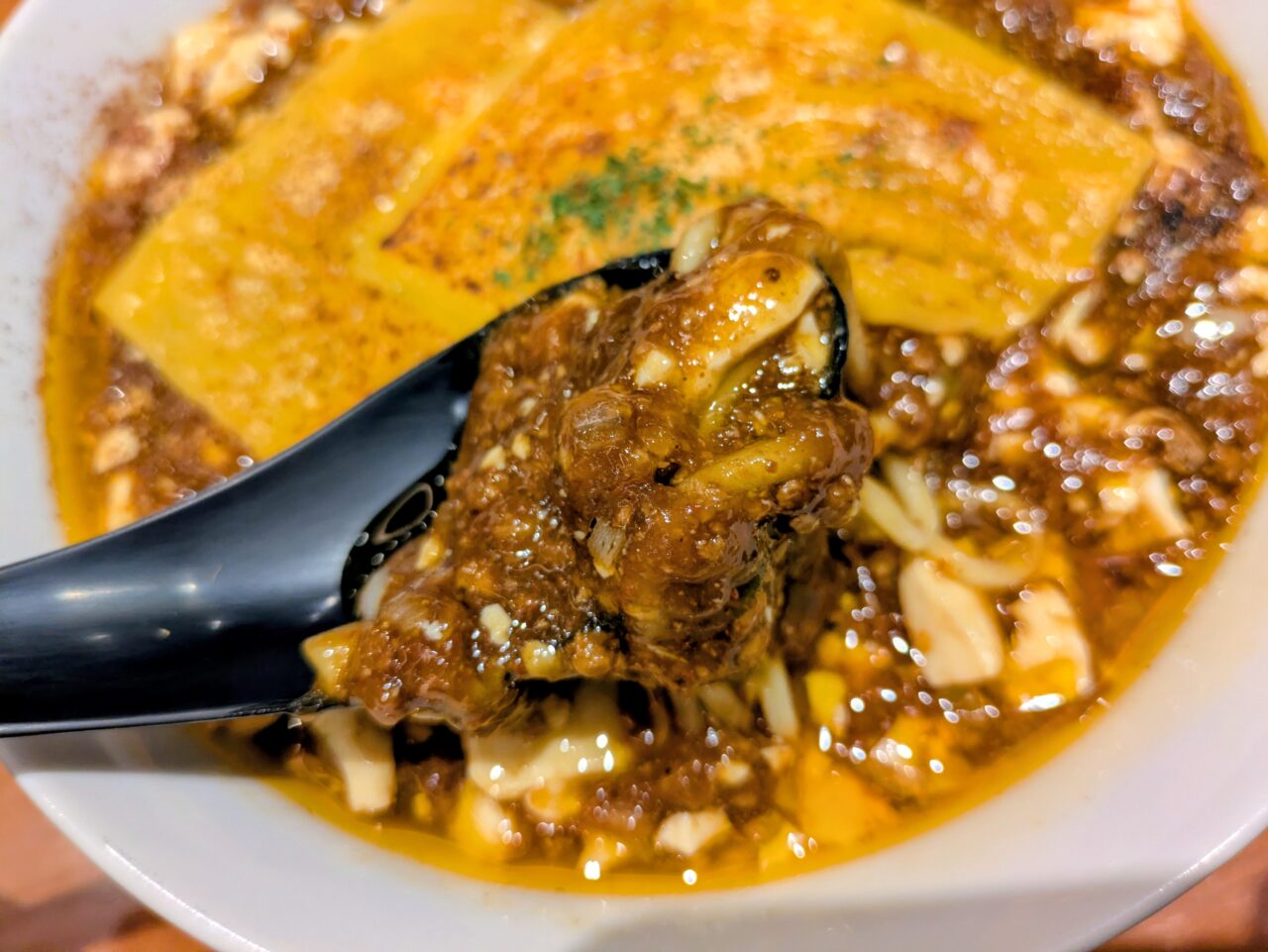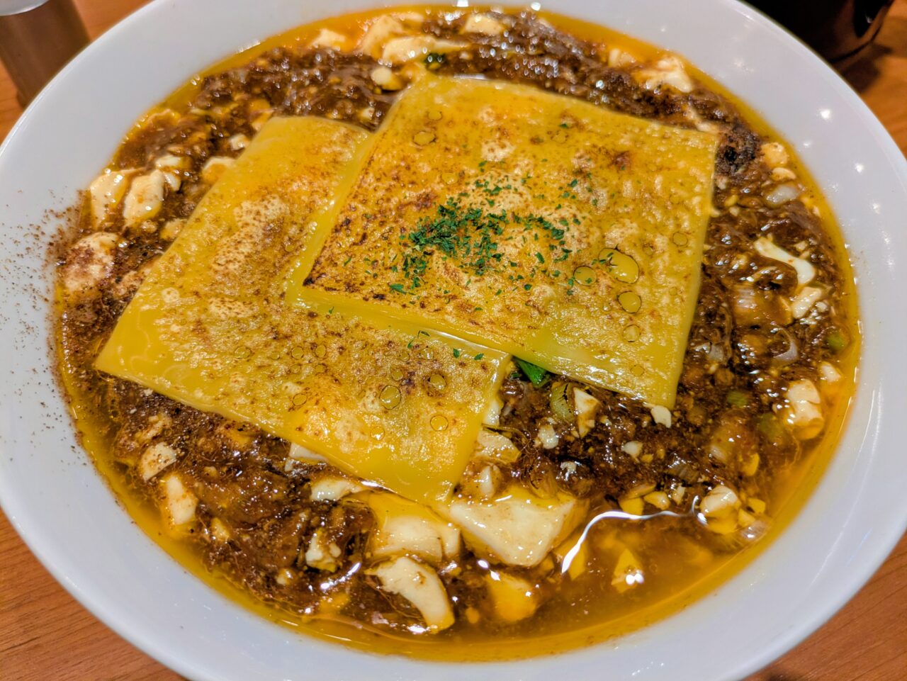 こちらが焼チーズ麻婆麺。山椒の香りと共にチーズの香ばしさが鼻の奥を突き抜けます。