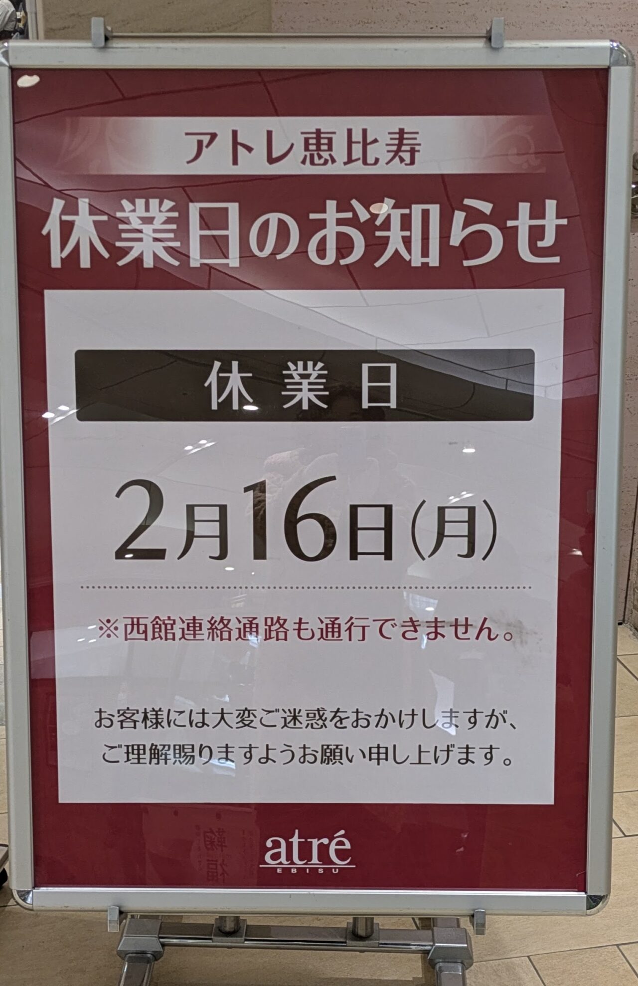 西館連絡通路も通行できなくなります。普段、恵比寿駅のアトレでお食事をされる方やお買い物をされる方はお気をつけ下さい。翌日の2月17日からは通常営業に戻ります。