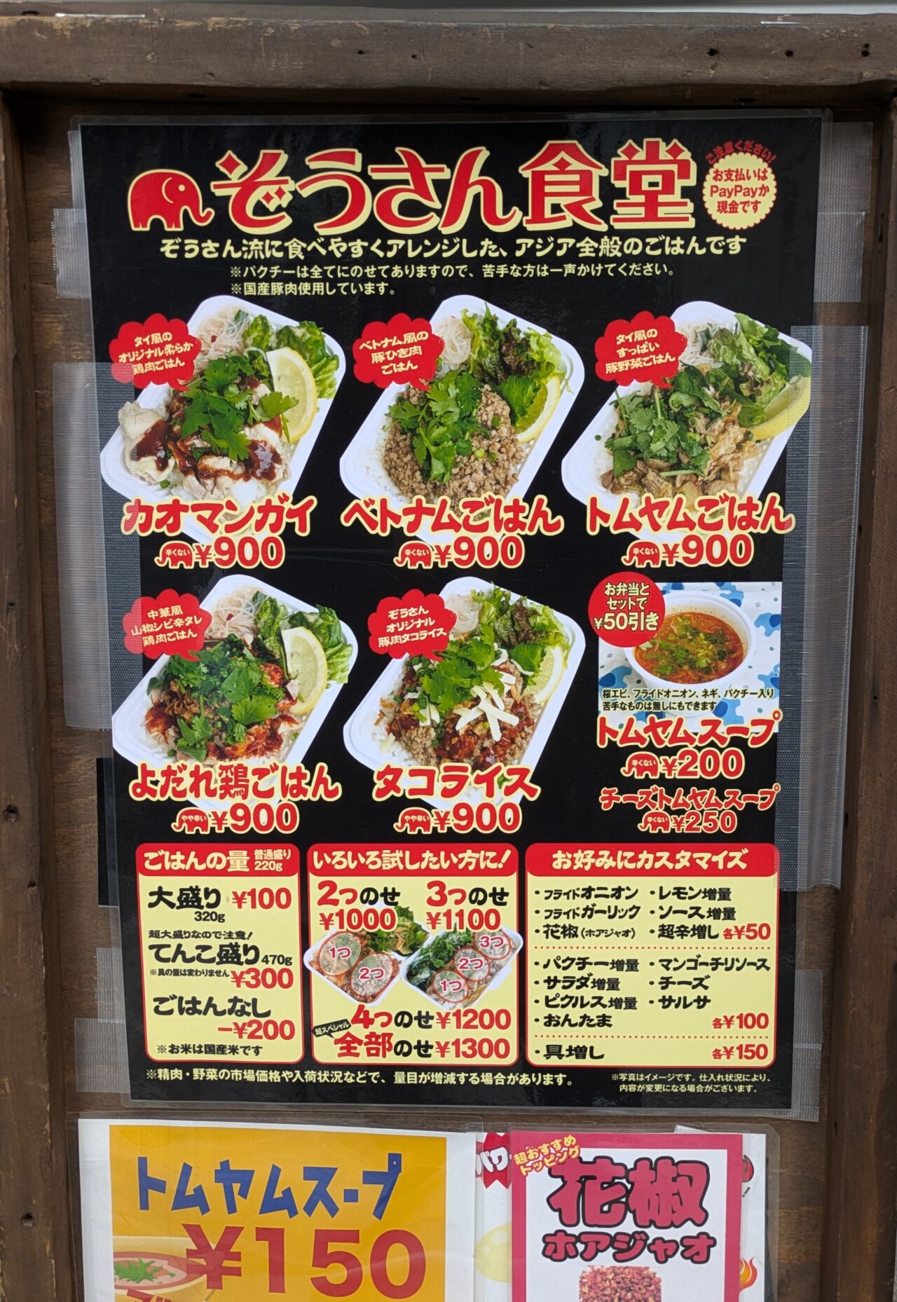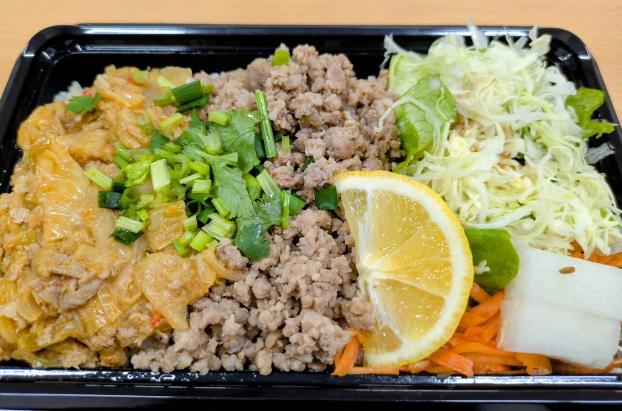 ランチボックスは、5種類のメニュー(カオマンガイ、ベトナムごはん、トムヤムごはん、よだれ鶏ごはん、タコライス)の中から選べます。単品でも十分楽しめますが、2つのせ・3つのせで自由に組み合わせるのが人気です。