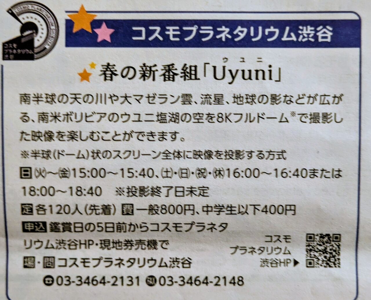 【渋谷区】コスモプラネタリウム渋谷では、春の新番組「UYUNI」の投影が開始されます!