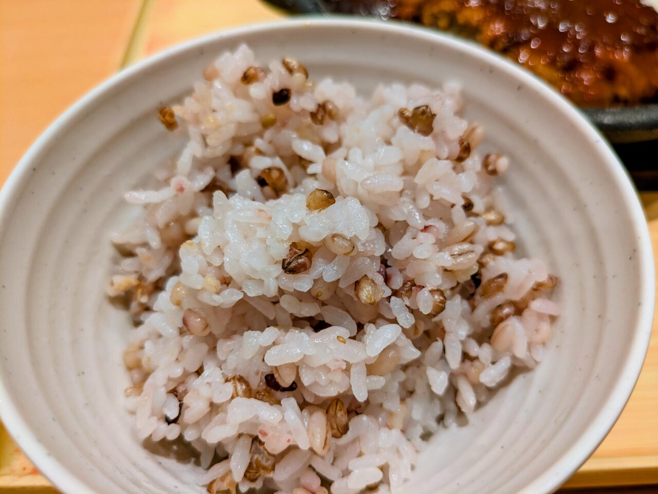 ご飯は白米かもち麦から選べます。やよい軒のもち麦ご飯、プチプチ食感で美味しいです。