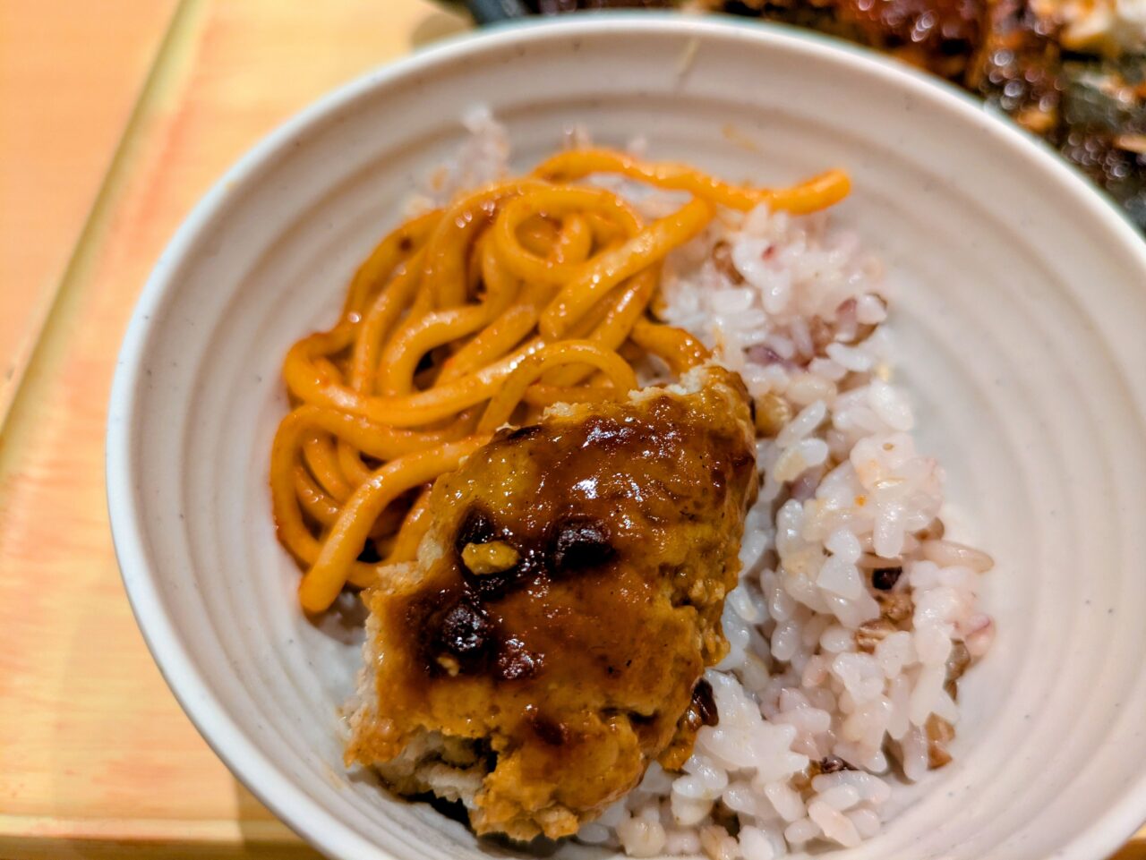 ケチャップ味のスパゲッティとデミソースのハンバーグをご飯の上に乗っけてガツガツカッ喰らうのが最高に幸せでした。