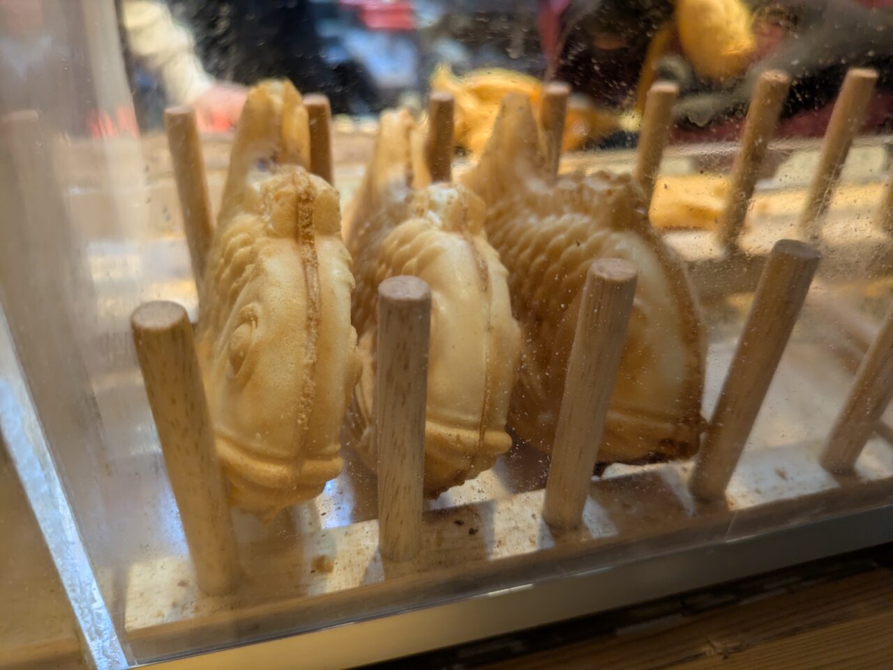 ショーケース内に並ぶ3匹のたい焼き。たい焼きの歴史は古く、今から100年以上前の明治時代に今川焼きから派生したものなんだそう。飛行機やカメなど様々な形が生まれましたが、縁起が良いという理由で「めでたい」の「鯛」の形が主流となったようです。