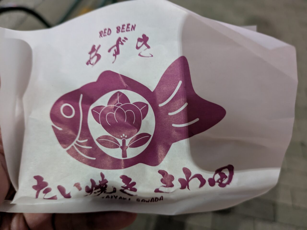 注文が入るとすぐリベイクしてくれるので、焼き立てのような熱々が渡されます。お店の定番の味、あずきのたい焼きが焼きたてホカホカでとっても美味しそう♪「今すぐに食べるべし!」と脳が指令を送る最高のコンディションです。