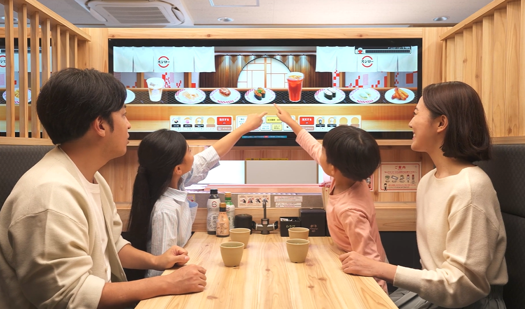 画面上で流れるおすしを映像で見ながら、画面を指で操作し商品を注文することができるほか、みんなで画面を見ることができ、同時に操作も可能です。