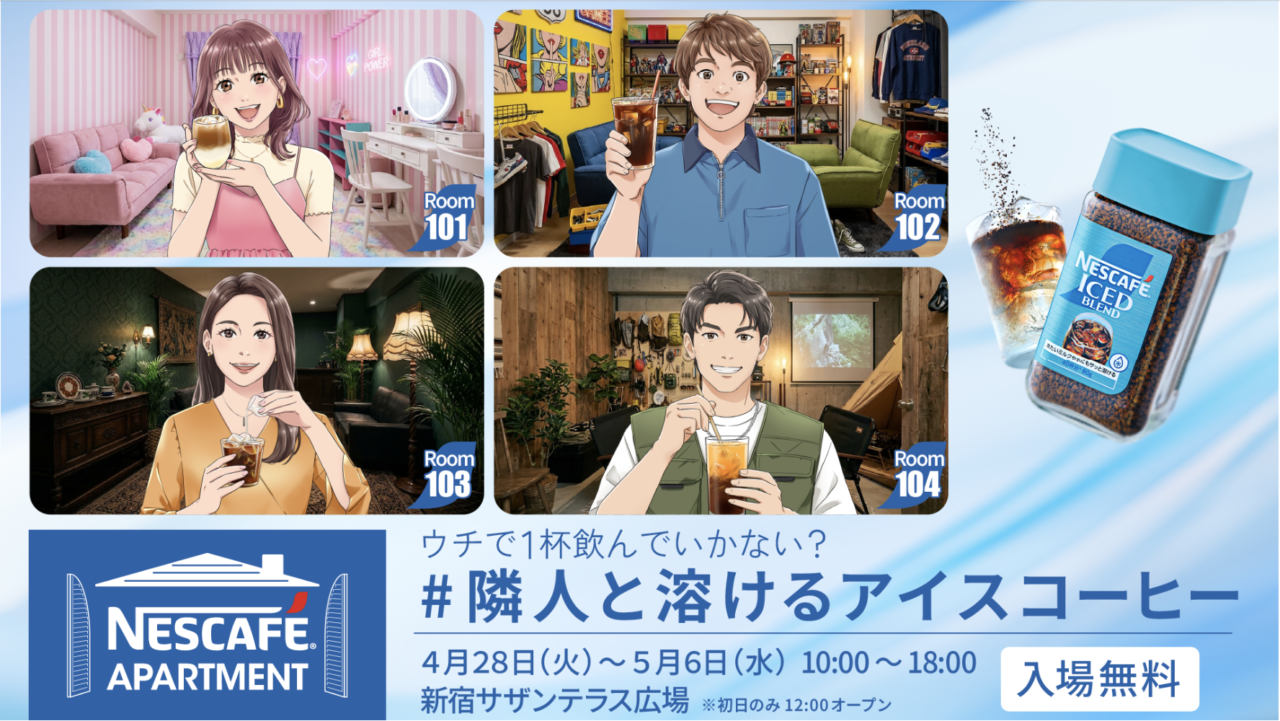 イベント初日には、「どこかにいそうな隣人」をイメージした4人の人気インフルエンサーが「スペシャル住人」として登場し、それぞれの暮らしに寄り添った「ネスカフェ アイスブレンド」の楽しみ方が紹介されます。
