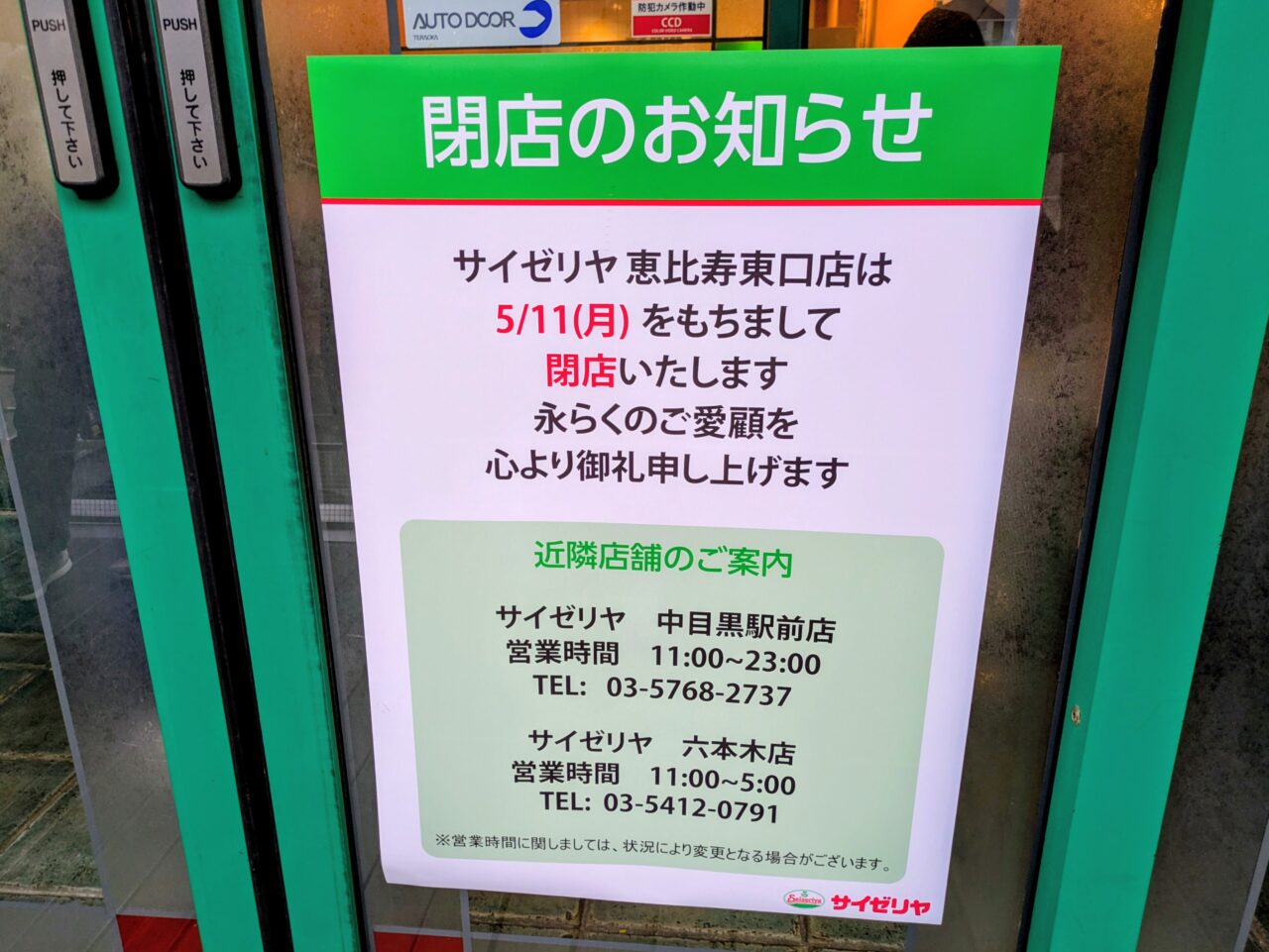 【渋谷区】悲報。サイゼリヤ恵比寿東口店が2026年5月11日をもって閉店。